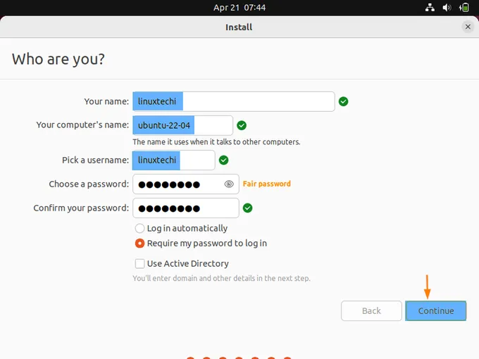 在此步骤中,指定本地用户名及其密码,指定系统的主机名。我们会在安装系统后使用该用户。