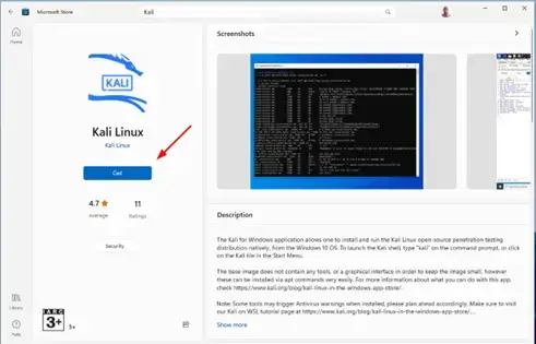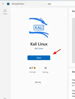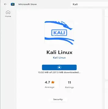 下一步是安装 Kali Linux,请前往Microsoft商店并搜索“Kali Linux”应用程序。