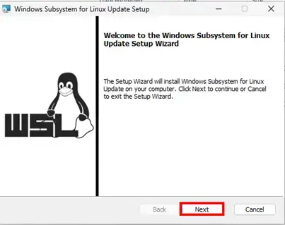 这将打开 WSL 安装向导,如下所示。单击“下一步”并接受默认选择。