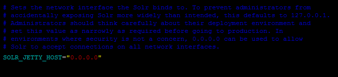 搜索 "SOLR_JETTY_HOST" 变量,取消其注释,设置为 "0.0.0.0"